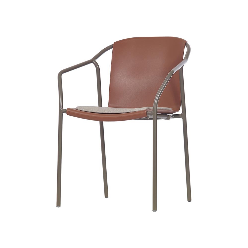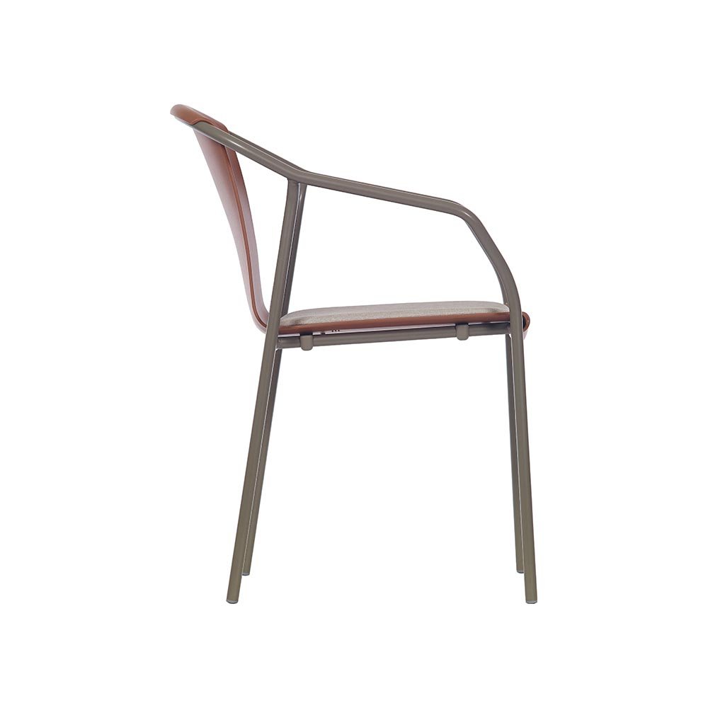 Кресло с подлакътници за вътрешно ползване. Рамка от лакиран алуминий. Тапицирана седалка от полипропилен (50% винил/50% полиестер). Нехлъзгащи се капачки. Много лесен за почистване и дезинфекция. Продукт за обществена и домашна употреба.